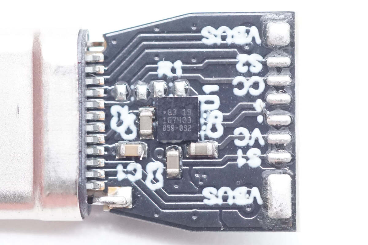 酷乐炫雷电5数据线的USB-C模组由一块黑色PCB板和一个USB-C公头组成,PCB板正面是一颗E-Marker芯片以及一些阻容元器件,末端为电源及信号线的焊盘,背面也预留了一些信号线焊盘。从PCB板与USB-C接口连接处可以看到,该模组采用的是24Pin设计,以满足高速传输的需求。